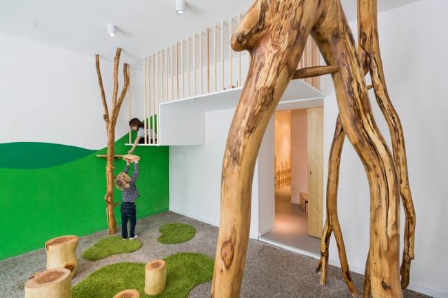 2013-7-10柏林的這座幼兒園以“自然”為主題,干凈的白色墻壁,綠色的墻壁和簡單幾塊隨意的地毯,幾根原木既可以作為孩子攀爬的樓梯也可以作為配飾使整體顯得更自然,不論是儲物柜或是衣架也都是由木頭制成,盥洗室淡淡的綠色瓷磚也貼合著自然的主題,孩子在這里成長,似乎很容易可以融入大自然。...[繼續閱讀] -