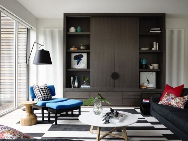 2013-7-12這間黑白相間的住宅位于澳大利亞墨爾本,由MimDesign設計完成。5口之家想創造一個有趣和溫馨的環...質感,一條寬大的走廊通向開放式廚房,客廳和餐廳擁有充足的自然光照。木地板、黑色沙發、黑色儲物柜、木餐桌上懸掛的銅燈,黑色的樓梯及柵欄式圍欄,臥室里黑底白花墻紙,搭配一些藝術品和裝飾品,顯得簡潔而穩重。[繼續閱讀] -