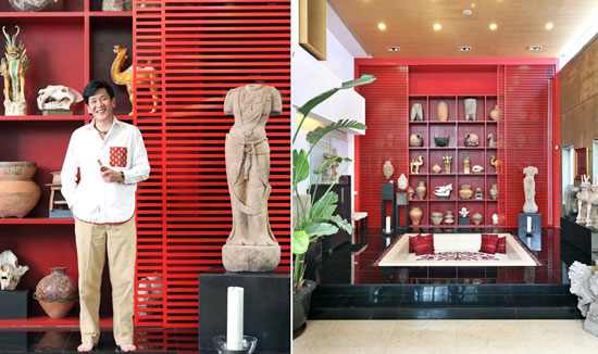 2012-11-16在十幾年前,馬躍從很多的可能性中,選擇了這個郊區別墅當做作他日后長期居住的家。多年的海內外奔波后,北...客廳邊廊旁邊有一個通向二樓起居室的樓梯,與起居室玻璃地板的結合讓整個空間通透又具有流動的意味,這也是風水學中氣運流通的象征。一個大型的紅色木質博古架上擺放著他的珍愛之物,中式的柜體又因為亮麗的漆色而變...[繼續閱讀] -