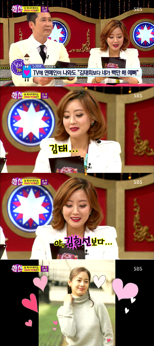 2013-4-3韓國演員金喜善在主持節目《話神》時,表露對金泰希的“嫉妒心”而引發笑聲。金喜善在2日晚播出的SBS綜藝節目《話神——支配心靈的人》(簡稱《話神》)中,作為韓國公認美女說道金泰希時,故意將其名改為自己的名字而引發笑聲。節目中,“男人對女人說謊時”第七位,原本應該是“你比金泰希要美上百倍”,但金喜善故意...[繼續閱讀] -