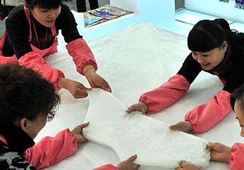 2012-1-111月6日,“2012安徽名優農產品綠色食品(北京)交易會”在北京全國農業展覽館開幕,為北京百姓展示了豐富的安徽土特產品。圖為來自安徽合肥的絲綢女現場表演絲綢被子的手工拉絲工藝。其中每一個絲片由50個蠶繭組成,一床絲被則由數十個絲片拉制組合成。...[繼續閱讀] -