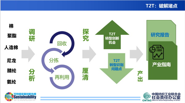 考慮到目前循環設計仍舊處于概念提出與呼吁的初級階段,循環創新的技術、工藝和設備創新不足,缺乏頂層設計及相應的政策、配套制度和標準體系需進一步完善,并且綠色消費市場驅動力不足,缺乏推廣循環時尚的專業平臺和專業人才。中國紡織品循環創新研究項目為推動變革,中國紡織工業聯合會社會責任辦公室副主任兼可持續發展項目主任胡柯華重點介紹了項目的工作規劃,分享預期目標和工作計劃。本次項目重點聚焦六種主要紡織纖維材料(Cotton 棉、Polyester 聚酯纖維、MMCF 人造纖維素纖維、Nylon 錦綸、Acrylic 腈綸和Elastane 氨綸)的紡織品的回收、分揀、再利用過程中的現狀與問題,探索技術創新路徑和商業模式、市場機會,撰寫中國T2T產業創新報告。同時,項目將為參與廠商開展能力建設,以及召開T2T產業創新報告發布會,為紡織行業循環轉型提供產業全景圖。